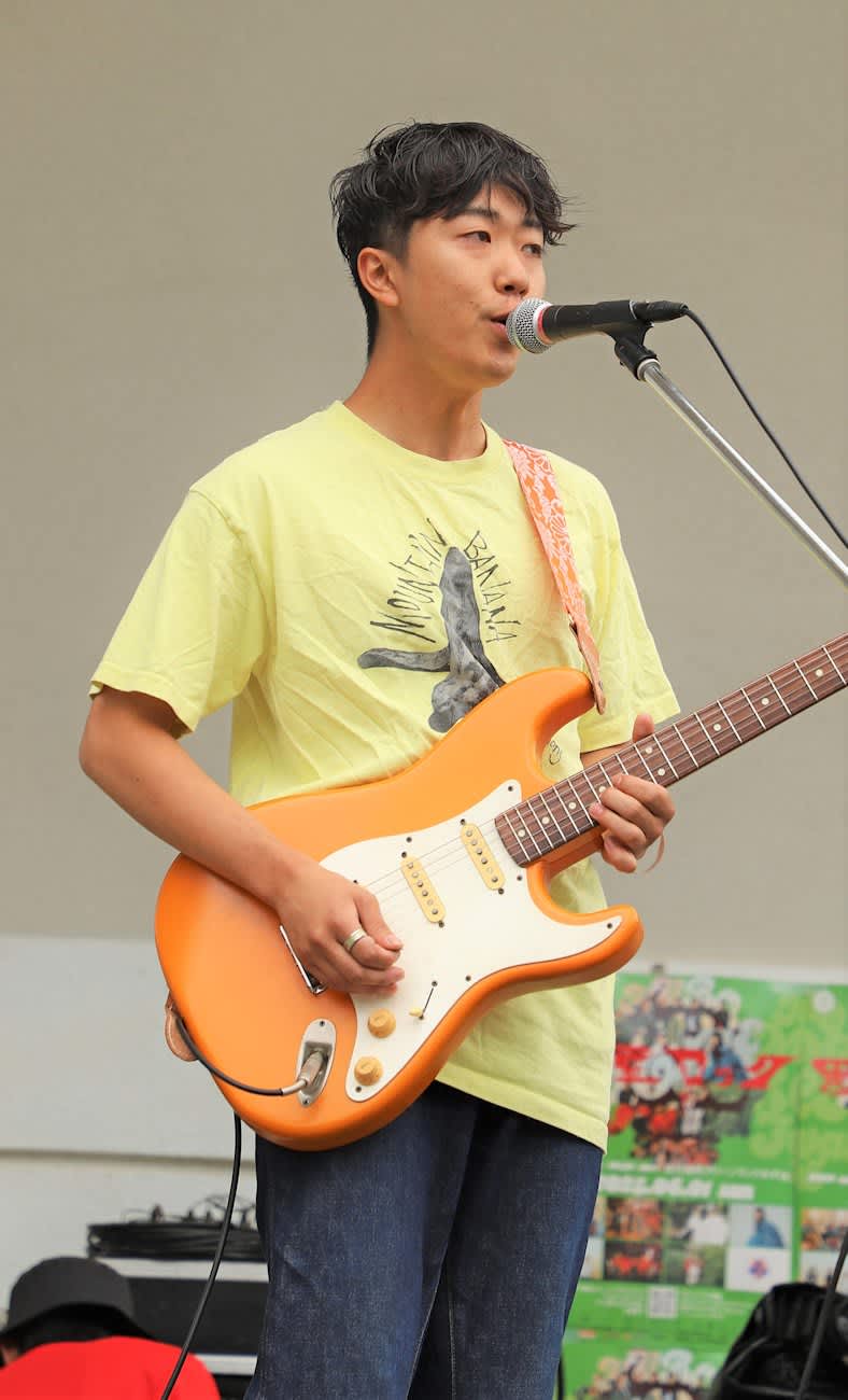 コバタヨシタネさん(25)は、京都府京丹波町で1日にあった野外音楽フェス「黒豆ロックフェスティバル」に、京都を拠点とするバンド「地球から2ミリ浮いてる人たち」のギタリストとして出演した。