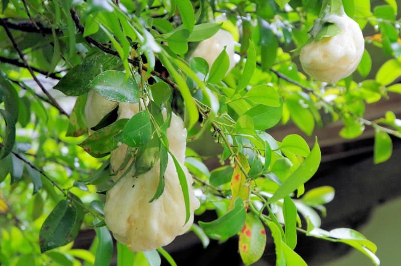 摂社・厳島神社の堀を覆うように茂るサカキの木々に、握り拳より大きな10個以上が産み付けられている。