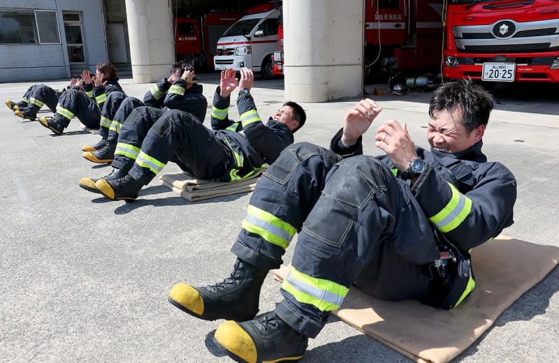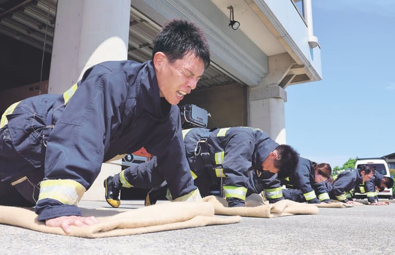 本格的な暑さを前に毎年行っている。例年は7月初めから始まるが、真夏日予報が続いたため開始を1カ月ほど早めた。吉田昌司隊長(48)は「火災現場はさらに暑い。そんな中でも常に100%の活動ができるよう準備している」と話した。