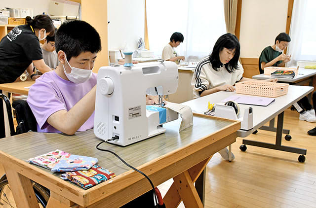 ティッシュケースを作った3年柴崎友洋さん(15)は「ミシンの糸が絡まることもあり大変だが、上手にできた。布の色や柄に合わせてボタンを選んでいる。たくさんの人が買ってくれたらうれしい」と話した。