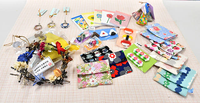 マグネットやビーズストラップ、ティッシュケース、香り袋など10種類計270個を納品した。メモ帳の表紙にはバラやヒマワリが描かれており、生徒たちの感性が光る。アイロンビーズのマグネットはすしやおにぎり、花などの形がかわいらしい。50~300円で販売している。