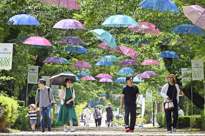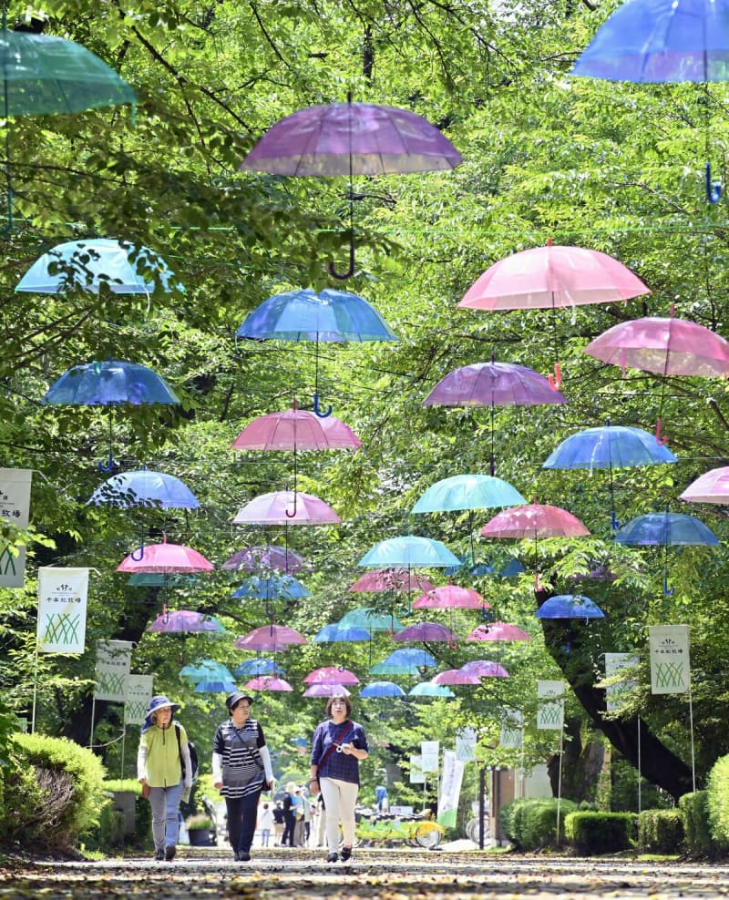 来場者が減少する梅雨の時期に観光客を呼び込もうと企画。にぎわい広場と桜並木通りに約70本の傘を設置した「アンブレラロード」のほか、4カ所のフォトスポットを用意した。