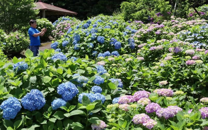 約5000平方メートルの「あじさい園」に約2600株を植樹。標高約450メートルに位置し、平地より2週間ほど遅れて開花する。来場者は青、紫、ピンクの花が遊歩道に連なる風景を満喫している。