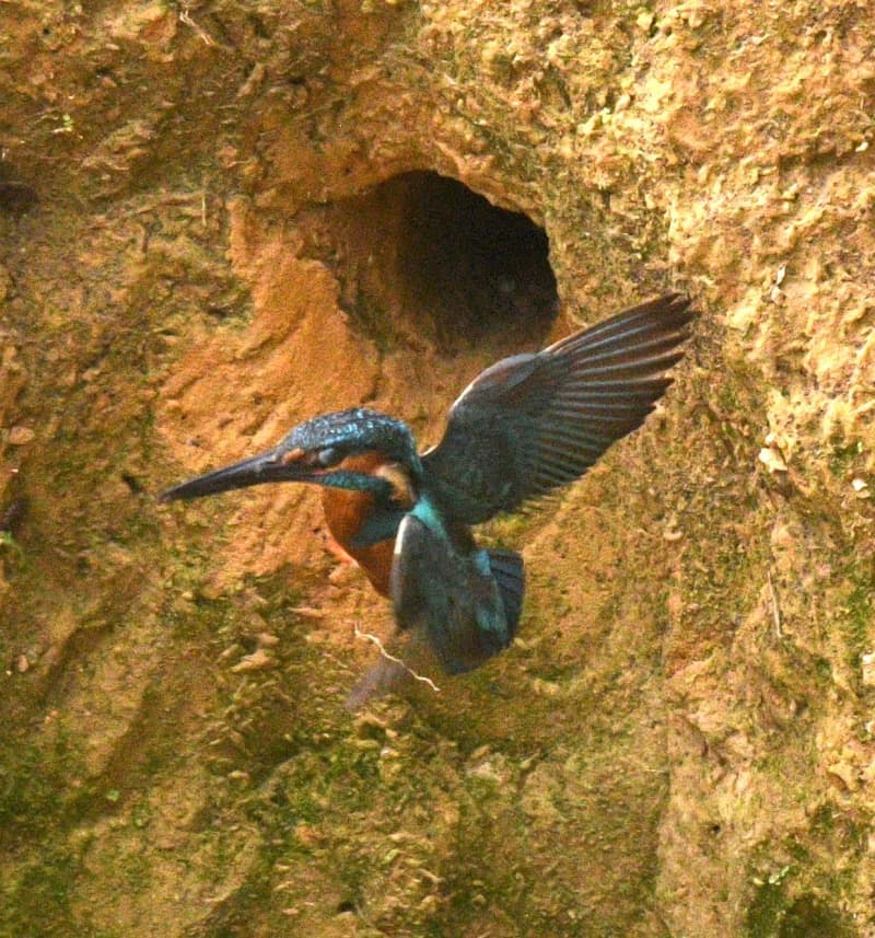 18、19日には、青い羽が美しい親鳥が餌をせっせと運ぶ様子が見られた。野鳥に詳しい屋我地鳥獣保護区管理員の渡久地豊さんは「あと1週間ほどで巣立つだろう。カワセミが成長するのに適した良い土手で巣を作っている。普段は子どもたちがいてにぎやかだが、いない時間帯や日曜などに巣作りをしたのだろう」と話した。