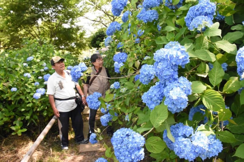 作州地域でアジサイが見頃を迎えた。紫や青、白といった大輪が訪れた人を楽しませている。