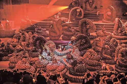 締めくくりの大蛇で暗闇から55頭が一挙に登場すると、会場のボルテージは最高潮に達した。多彩な照明や迫力ある音声が流れる中、須佐之男命(すさのおのみこと)と大蛇が激しく立ち合った。
