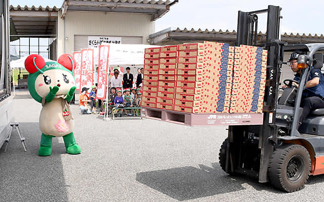 寒河江西村山産サクランボの県奨励品種「紅秀峰」の出発式が19日、寒河江市のJAさがえ西村山東部集出荷施設で行われた。関係者や地元園児が、露地物を積んだ首都圏市場向けのトラックを見送った。