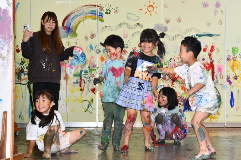 この日はあいにくの雨にもかかわらず園児や保護者、卒園生ら約250人が参加。子どもたちは壁や遊具などに思い思いに落書きをしたり、友達同士で絵の具を塗り合ったりして楽しんでいた。年長小貫蒼真(おぬきそうま)ちゃん(5)は「お部屋いっぱいに絵を描けて楽しかった」と笑顔だった。