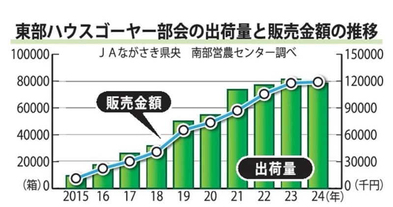 長崎県諫早市の高来、小長井両町でゴーヤーを栽培するJAながさき県央東部ハウスゴーヤー部会(谷渡亮二部会長、37人)の出荷量と販売金額が、品質の高さが市場から高評価を受け、右肩上がりで伸びている。販売金額は2022年から3年連続で1億円を突破。作付面積と新規就農者も増え続ける好循環を生み出している。