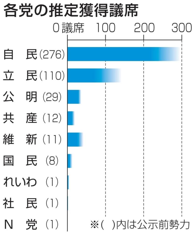 共同通信社は第49回衆院選に向けて23~26日、全国の有権者約11万9千人を対象にした電話世論調査を実施し、取材も加味して終盤情勢を探った。自民党は、公明党と合わせた与党で定数465のうち、国会を安定的に運営できる「絶対安定多数」(261議席)を視野に入れるものの、単独では公示前の276議席から減らす可能性がある。立憲民主党は伸び悩んでいる。日本維新の会は公示前勢力の約3倍となる30議席超の勢いで、公明、共産両党は堅調を維持している。