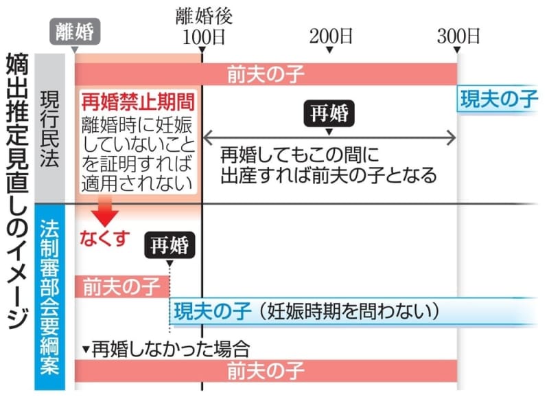 離婚後に別の男性との子を産んだ場合、前夫の子となるのを避けるため出生届を出さず、無戸籍となるのを防ぐ狙い。女性の再婚禁止期間(100日間)は廃止し、明治時代から続く「父子関係」のルールが変わる見通しとなった。2019年6月に当時の法相が法制審に諮問していた。